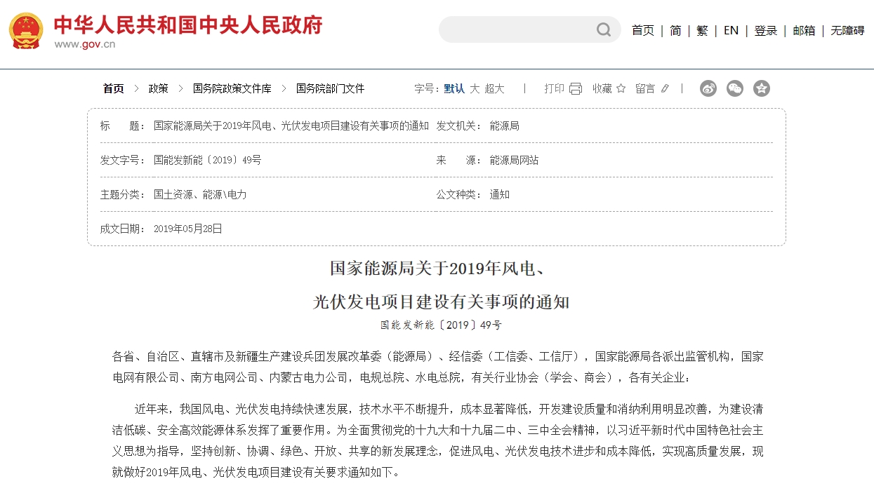 國家能源局關(guān)于2019年風(fēng)電、 光伏發(fā)電項(xiàng)目建設(shè)有關(guān)事項(xiàng)的通知
